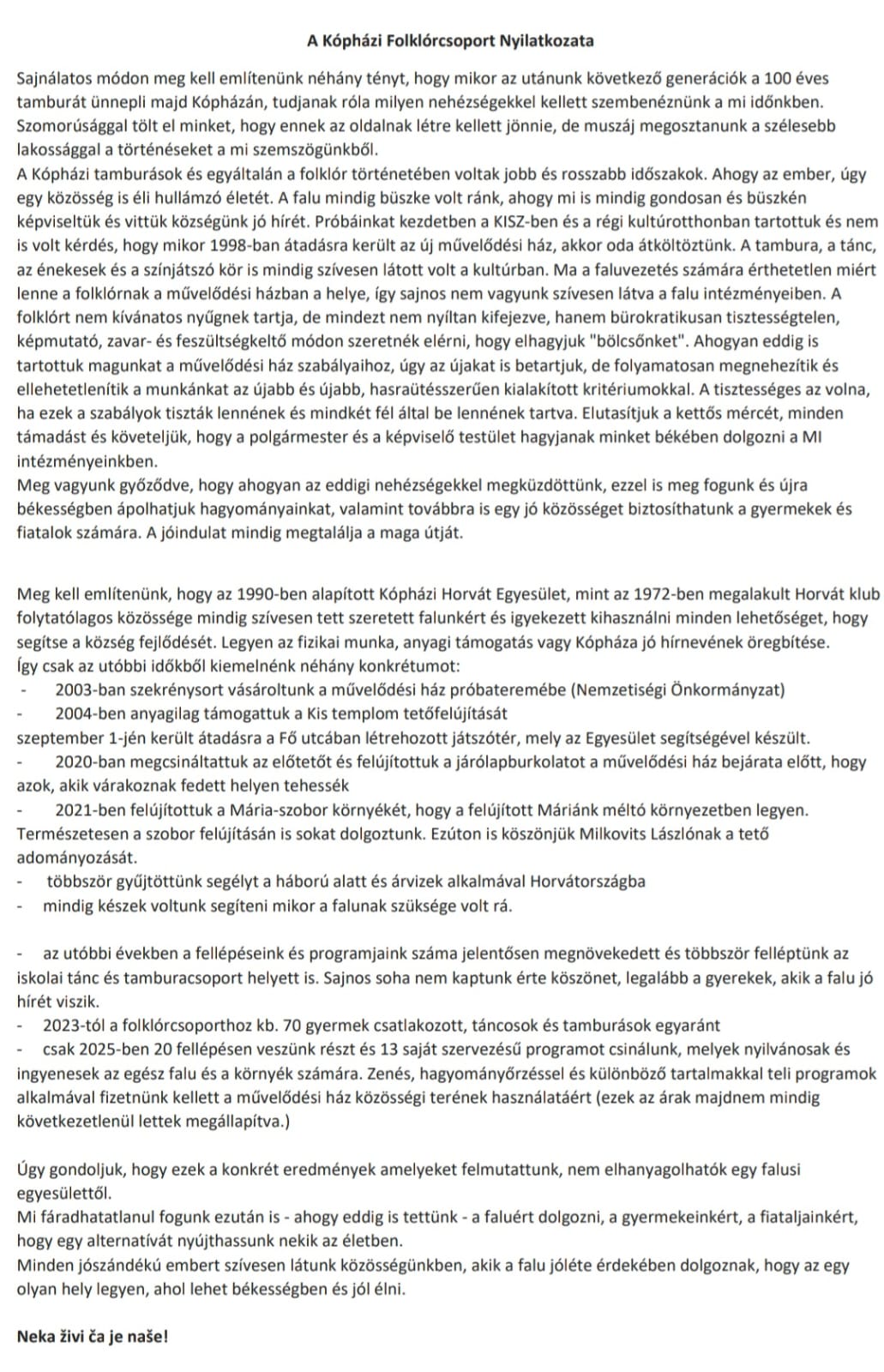 2025.09.25. | Izjava Folklorne grupe Koljnof / A Kópházi Folklórcsoport nyilatkozata