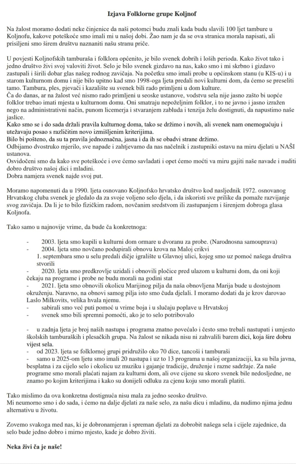 Izjava Folklorne grupe Koljnof / A Kópházi Folklórcsoport nyilatkozata
